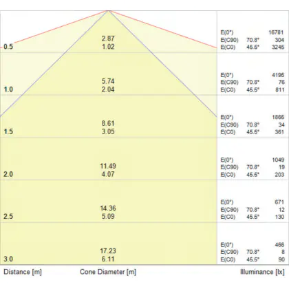 Der Abstrahlwinkel bezeichnet den Winkel, in dem das Licht aus der Lichtquelle ausgestrahlt wird. Er wird in Grad (D) angegeben. Je geringer die Gradzahl des Abstrahlwinkels ist, desto kleiner ist auch der Durchmesser des Lichtkegels, den die Lichtquelle produziert.