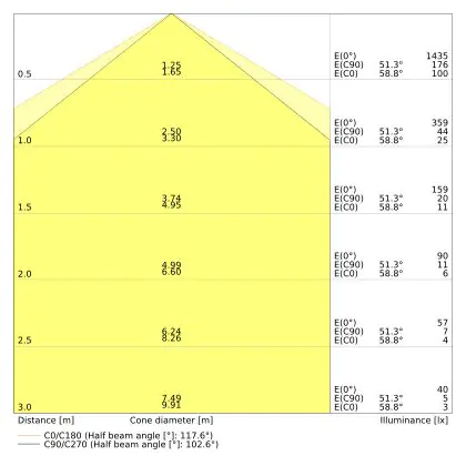 Le code couleur se compose de l'indice de rendu des couleurs (IRC) et de la température de couleur (Kelvin). Le premier chiffre indique le rendu des couleurs (1 = très mauvais rendu des couleurs, 9 = meilleure authenticité des couleurs). Le deuxième et troisième chiffre indiquent la température de la couleur. Exemple : Le code couleur "830" indique que la lampe a un bon rendu des couleurs (8) et une couleur de lumière blanche chaude (30 = 3000K). |