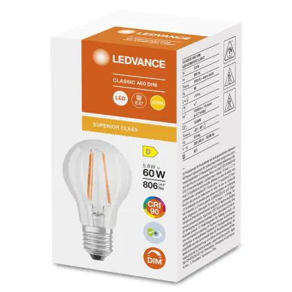 Cette ampoule Ledvance Superior Classic LED E27 Poire Filament Claire 5.8W 806lm - 927 | Dimmable - Meilleur rendu de couleur est l’alternative idéale pour la remplacement de votre ampoule classique de 60 W. La technologie LED intégrée vous offrira de nombreux avantages. Les ampoules à incandescence traditionnelles ont une durée de vie limitée. Cette alternative LED vous permettra de profiter d’un éclairage durable et fiable.