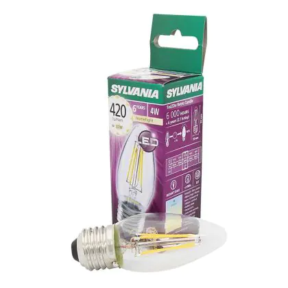 Cette ampoule Sylvania ToLEDo E27 Bougie Filament Claire 4W 420lm - 827 | Remplacement 40W avec son efficacité lumineuse de lumen par watt vous permettra de profiter d’un éclairage de qualité. Avec sa durée de vie de 15000 heures, vous n’aurez pas à vous soucier de son remplacement avant quelques années.
